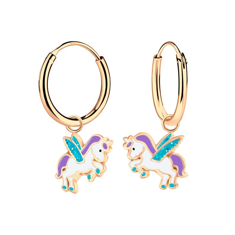 Μαγευτικά παιδικά σκουλαρίκια κρίκοι με κρεμαστό μονόκερο με φτερά, σε υπέροχη ροζ χρυσή απόχρωση. Ένα ονειρικό κόσμημα που συνδυάζει φαντασία και κομψότητα, ιδανικό για μικρές πριγκίπισσες που αγαπούν τους μονόκερους.
