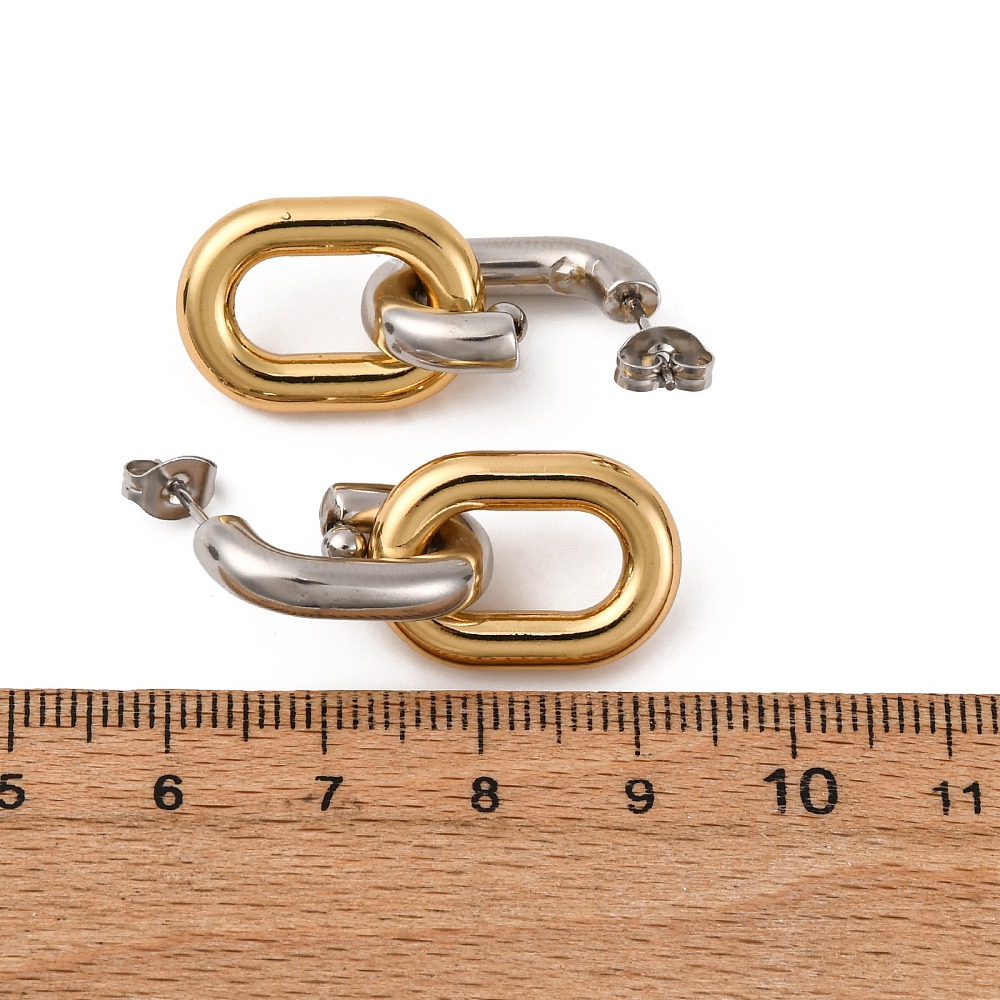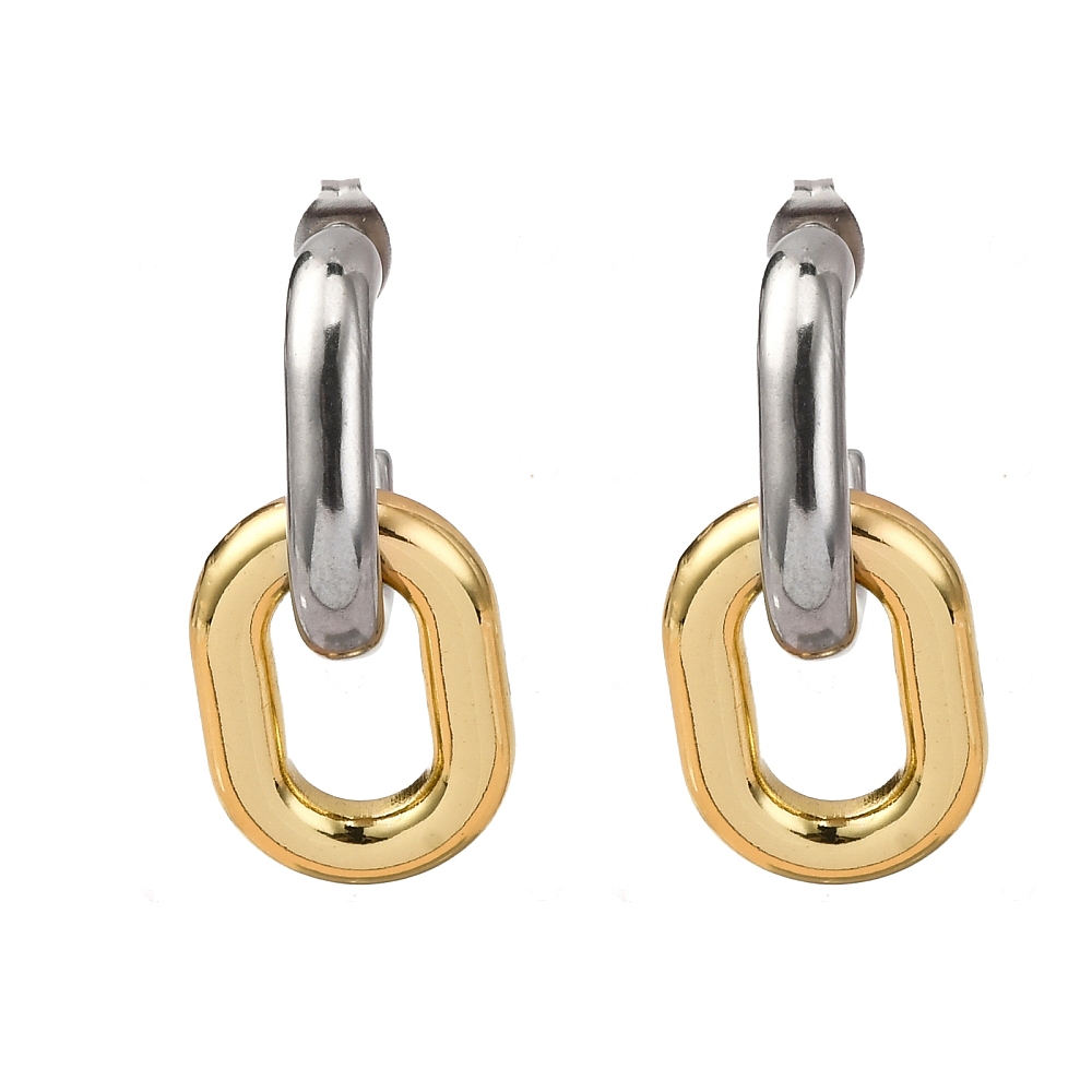 Τα Two Tone Oval Dangle Stud Earrings από ανοξείδωτο ατσάλι 304, επιχρυσωμένα με πραγματικό χρυσό 18Κ, είναι μια κομψή επιλογή που συνδυάζει το διαχρονικό με το μοντέρνο. Ο οβάλ σχεδιασμός με δίχρωμη αντίθεση (ασημί και χρυσό) χαρίζει μοναδική λάμψη και κίνηση, ιδανική για να αναδείξει κάθε εμφάνιση.